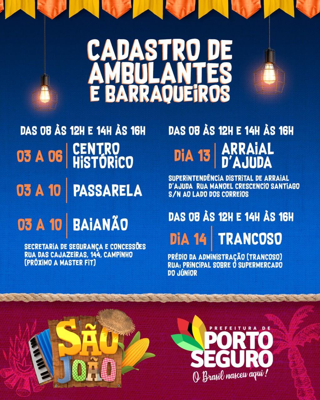 Os ambulantes e barraqueiros do Arraial d’Ajuda devem comparecer dia 13 de junho, no mesmo horário, na Superintendência Distrital do Arraial. Em Trancoso, o cadastramento acontecerá dia 14 de junho, no prédio da Administração local.