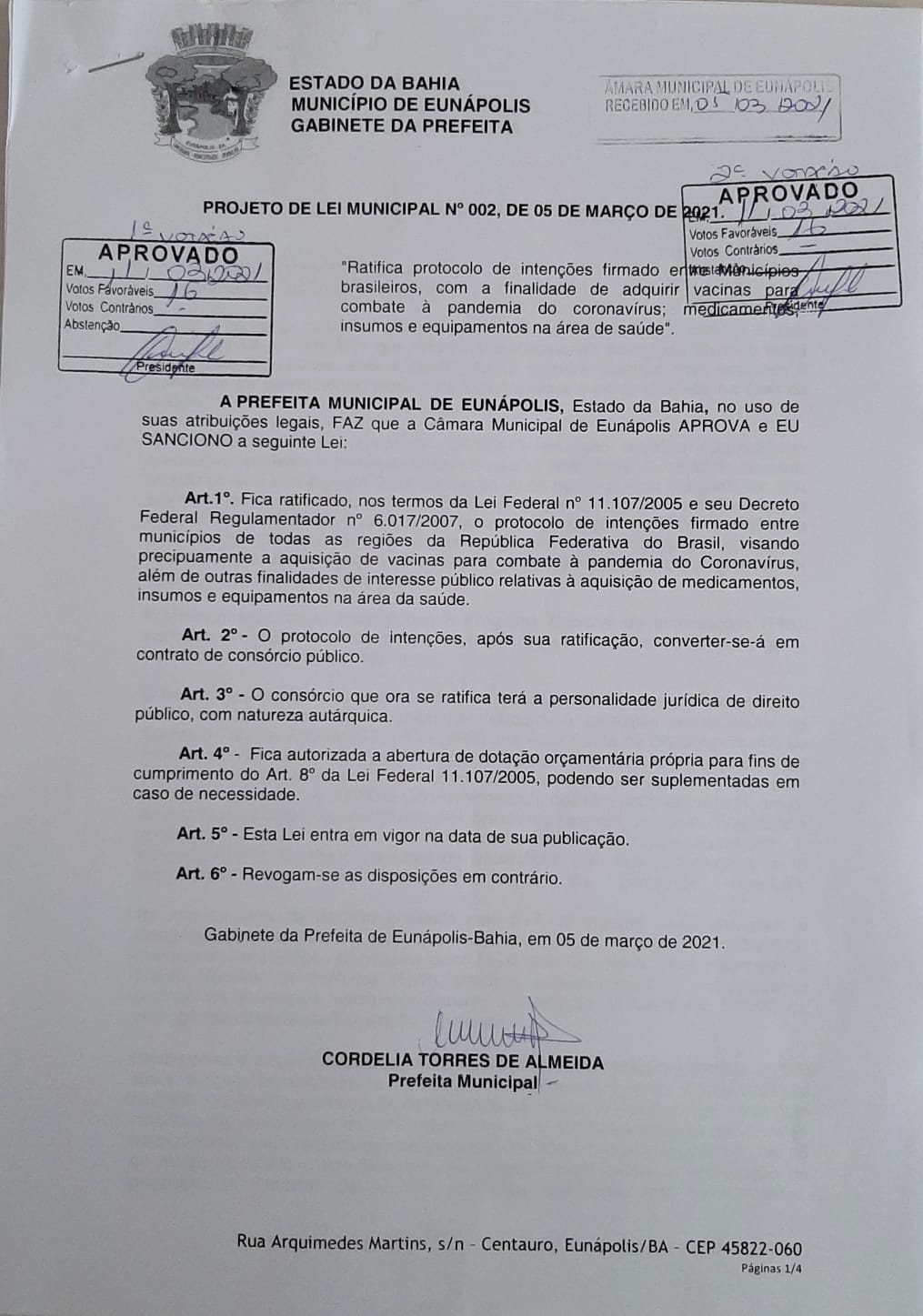 Nesta quinta-feira (11/03), a Câmara Municipal de Eunápolis aprovou, por unanimidade, em duas sessões extraordinárias, o projeto de lei de número 02/2021, de autoria do Executivo, que autoriza a Prefeitura a comprar doses de vacina contra a Covid-19, medicamentos, insumos e equipamentos, inclusive por consórcios, uma vez que a compra não tem previsão no orçamento aprovado e qualquer novo item de despesa precisa da aprovação do Legislativo.