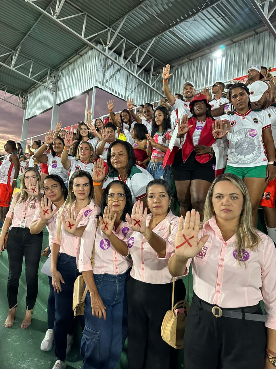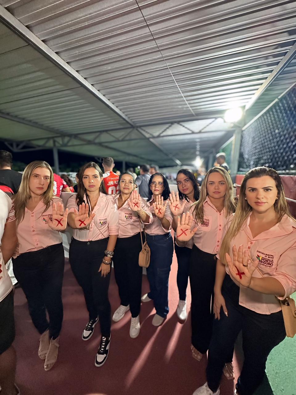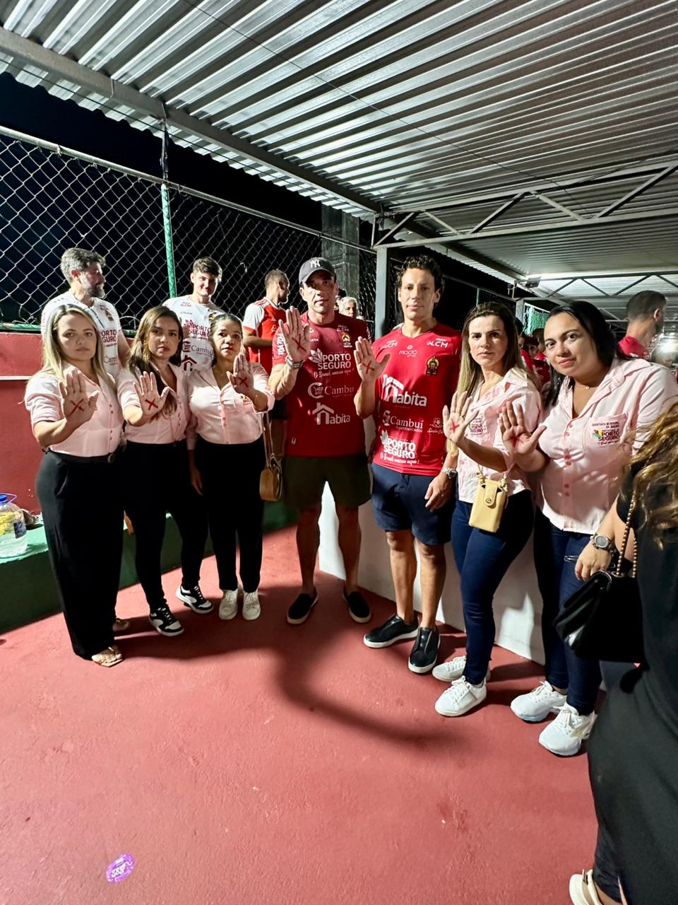 Durante o jogo, foram instaladas faixas, distribuídos adesivos e desenhado o X vermelho na mão dos jogadores, técnicos, torcida, e de algumas autoridades presentes, como o vice-prefeito Paulo Onishi e o secretário de Esportes, Hélio de Paula. “Queremos mostrar que ninguém aguenta mais a violência contra mulher e que todo lugar é lugar pra combater essa violência”, diz a coordenadora do CRAM (Centro de Referência de Atendimento à Mulher), Andrea Comenale.