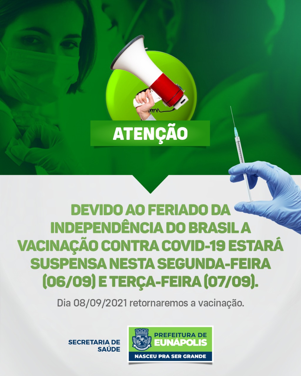 Covid - Secretaria Municipal de Saúde de Eunápolis avisa que nos dias 06 e 07 não haverá vacinação 5