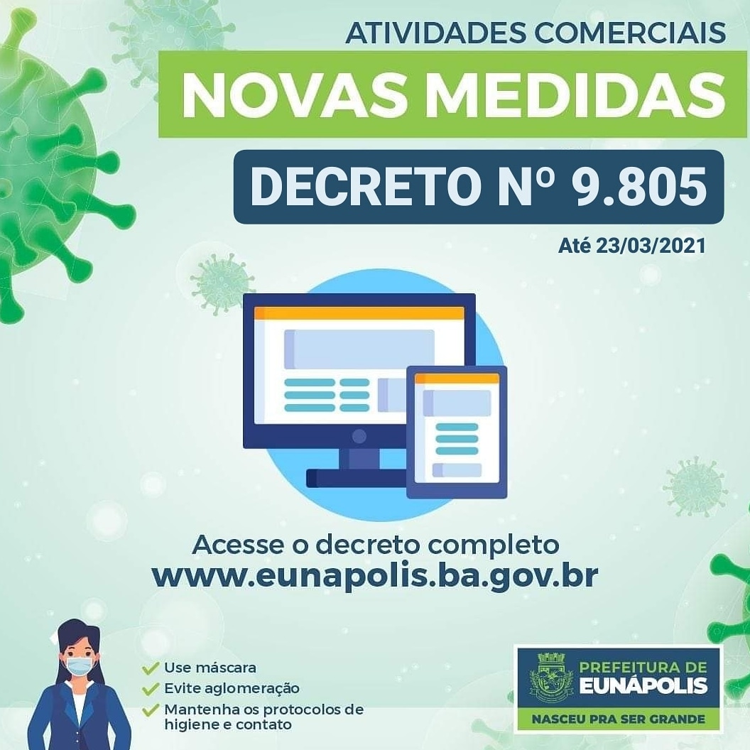 A Prefeitura de Eunápolis publicou hoje, 16, novo decreto que prorroga o horário de funcionamento das atividades econômicas e comerciais, além de cultos nos templos religiosos do município. A medida autoriza novas medidas para controle e combate ao coronavírus, em Eunápolis.