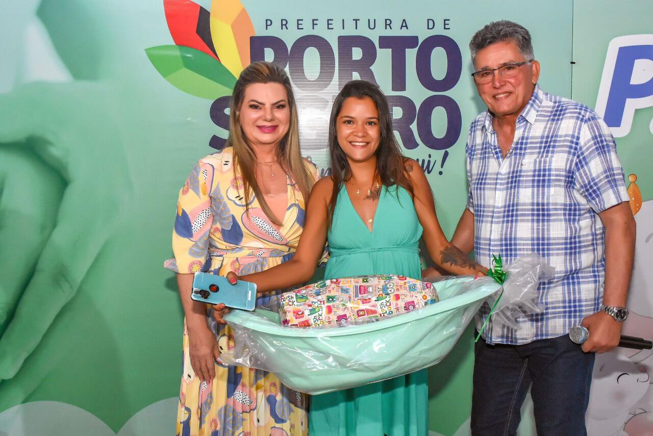 A solenidade foi iniciada com uma oração feita pela primeira-dama, Cristiane Chiacho, e após saudações das autoridades da mesa diretiva, o prefeito, Jânio Natal, falou às gestantes sobre os vários projetos que tem para a mulher em Porto, tanto nas esferas de saúde, profissionalizantes e de políticas públicas. “Estamos nos empenhando para breve termos uma maternidade e uma grande transformação na saúde municipal, além de ampliarmos benefícios às gestantes”, destacou, entregando o primeiro kit à Lucilene dos Santos que aguarda pelo nascimento do sexto filho.