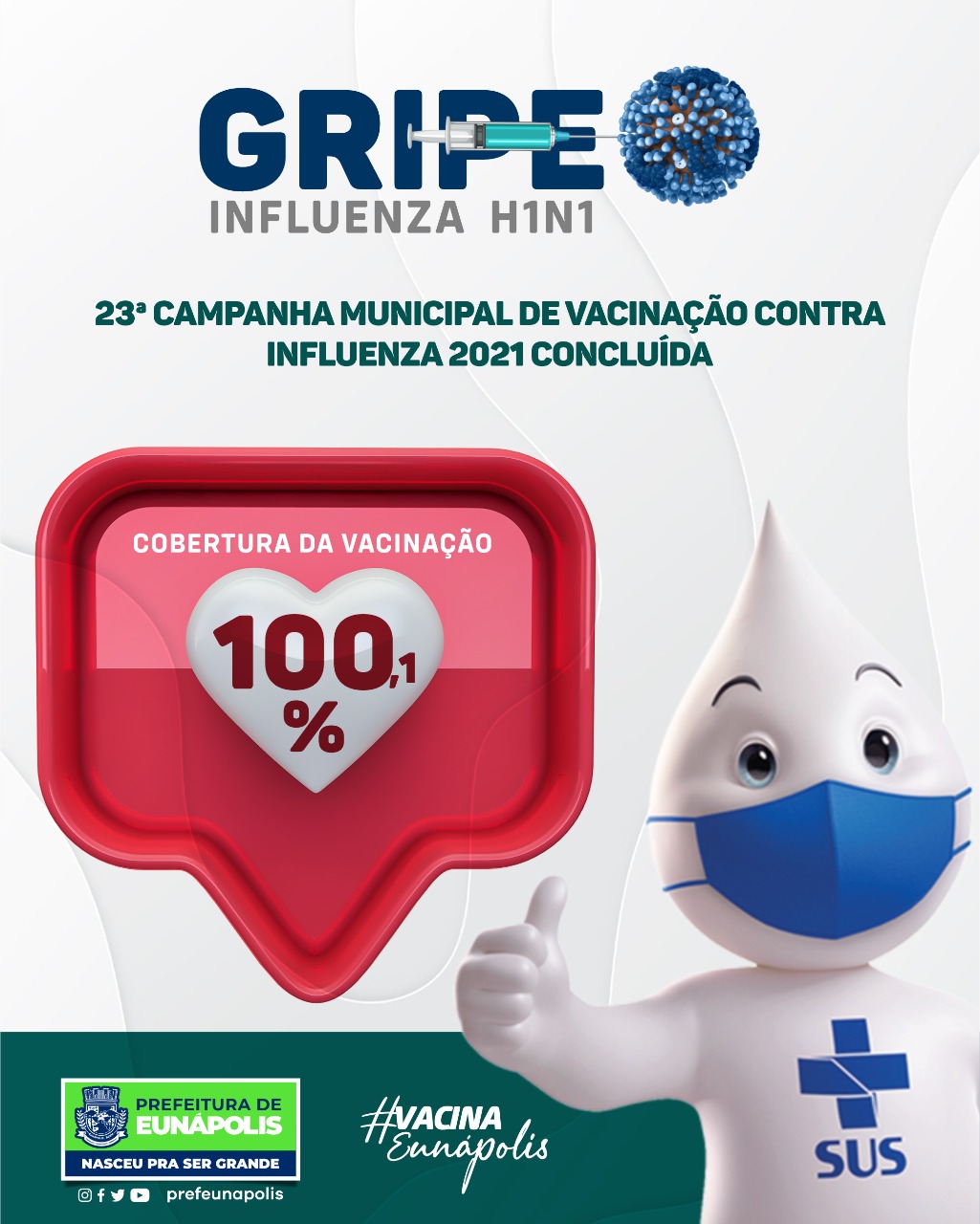 Comprometida com a missão de ofertar uma saúde pública humanizada e de excelência, a Prefeitura de Eunápolis concluiu com sucesso a 23ª Campanha de Vacinação Contra a Influenza H1N1 (gripe).