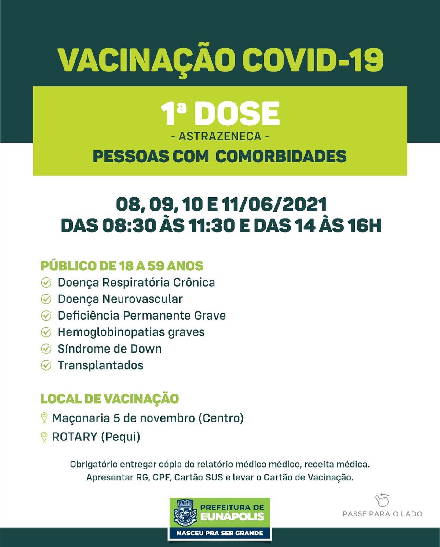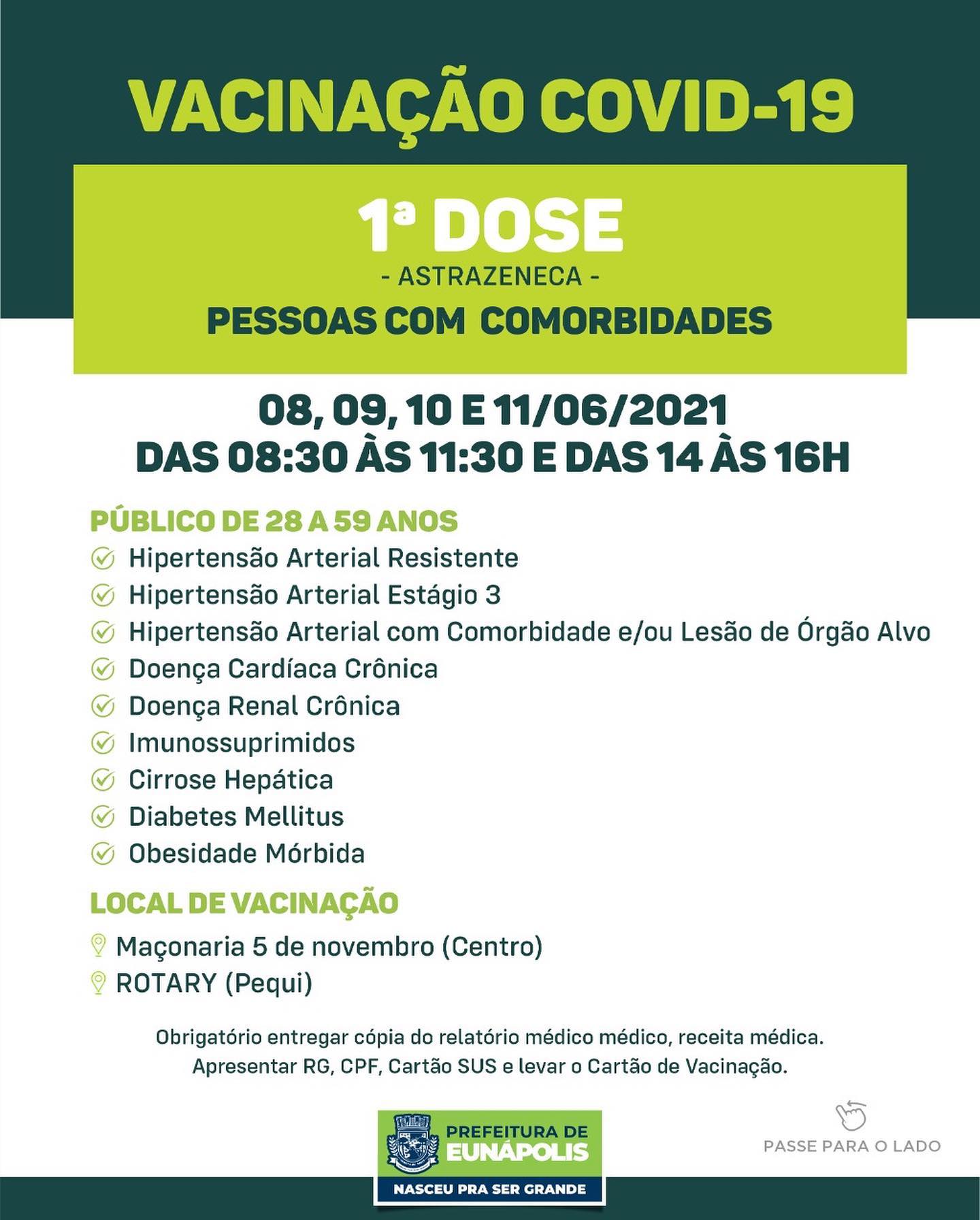 💉 Nos dias 08, 09, 10 e 11 de Junho, continuam a imunização da 1ª dose da vacina contra a Covid-19 do público de comorbidades.