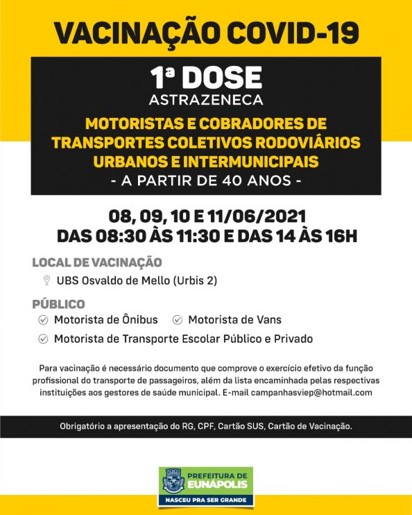 💉 Nos dias 08, 09, 10 e 11 de Junho, continuam a vacinação da 1ª dose da vacina contra Covid 19 para os motoristas e cobradores de transportes coletivos rodoviários urbanos e intermunicipais a partir de 40 anos.