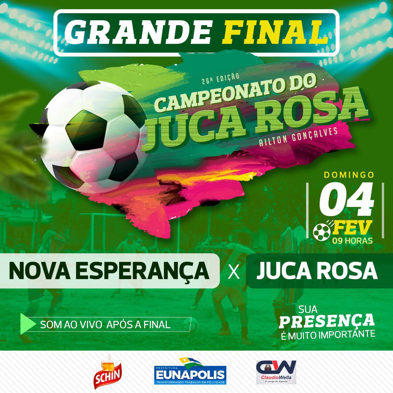 Neste domingo, 04/02, a partir das 09h, acontecerá a tão esperada final do 26º Campeonato Ailton Gonçalves de Futebol Amador do Bairro Juca Rosa. O mais tradicional Campeonato de Futebol da região colocará frente a frente o time do Juca Rosa, que tem em seu comando Giovani Marques, contra o Nova Esperança do bairro Alecrim I, comandado por Jaime Braga.