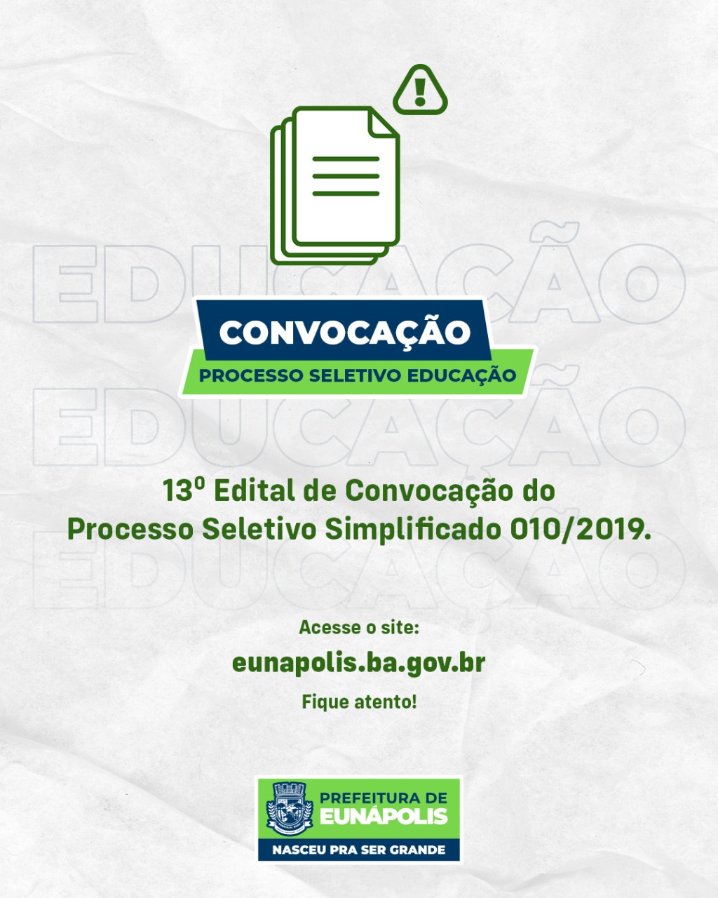 Edital da Prefeitura Municipal de Eunápolis, com data de quinta-feira, dia 17 de junho, convoca para os dias, 21 a 23/06 (segunda a quarta-feira), os Aprovados do Processo Seletivo Simplificado nº. 010/2019, para comparecerem à Sede do PROTOCOLO GERAL DA PREFEITURA MUNICIPAL DE EUNÁPOLIS, localizada na Rua Archimedes Martins, nº 525, Bairro Centauro, objetivando a apresentação dos documentos e dos exames necessários, e posterior assinatura do Termo de Contrato Temporário, para atender as demandas da Secretaria Municipal de Educação.