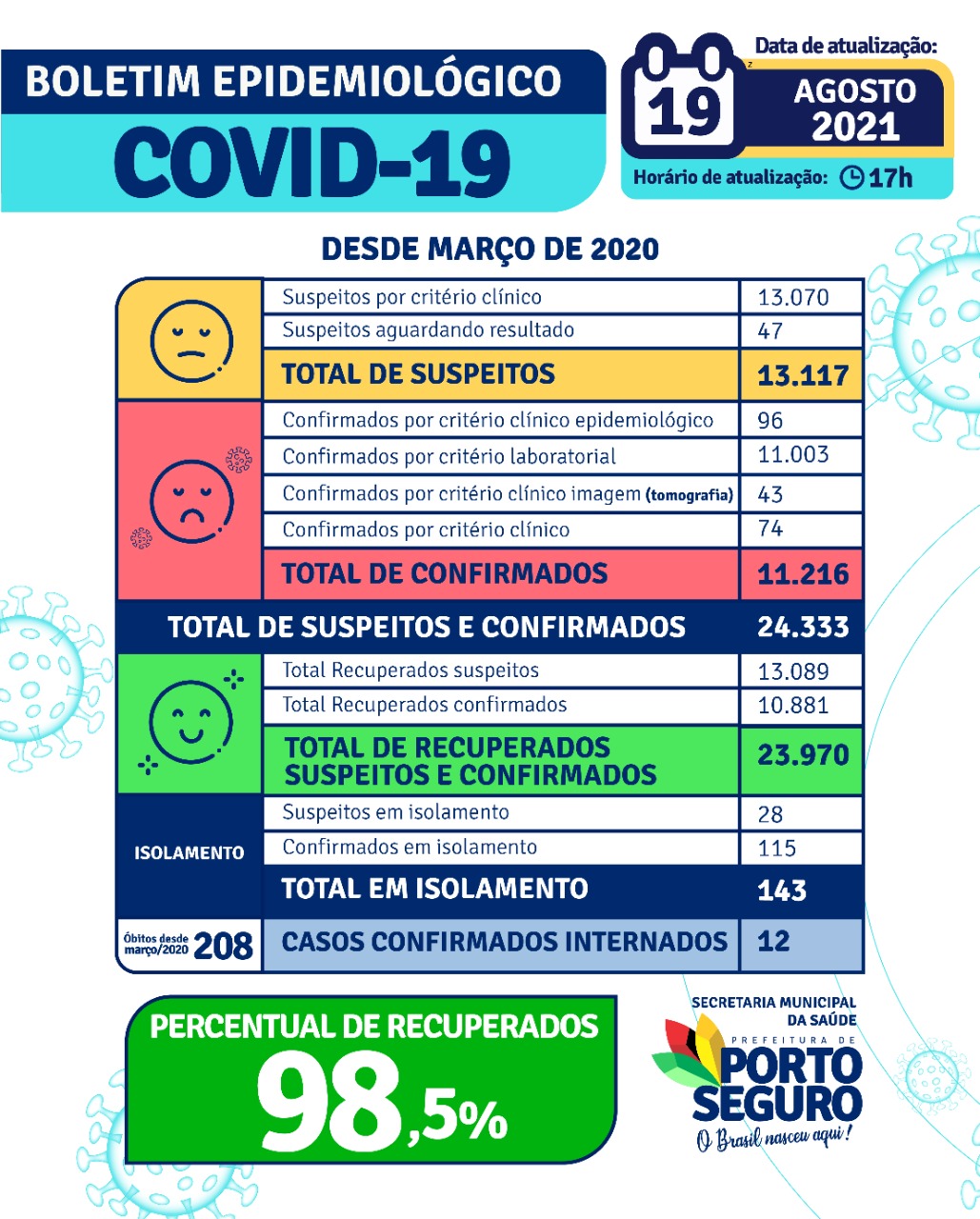 Porto Seguro hoje tem 23.970 pessoas recuperadas, totalizando um percentual de 98,5% entre os suspeitos e confirmados de COVID-19, sendo 208 óbitos desde março/ 2020.
