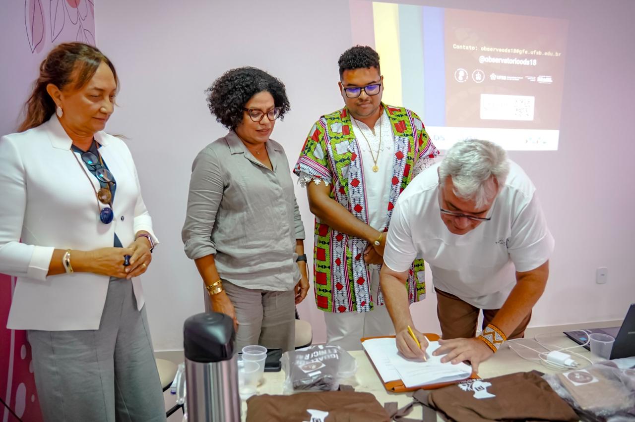 Participaram do ato o superintendente Danilo Souza; o secretário Cláudio Soares; a presidente do Conselho Municipal de Igualdade Racial, Gilberlice Menezes e a representante da ODS18, professora Maria Du Carmo e Inalda Barros. O termo foi assinado por Cláudio Soares, Maria Du Carmo e representantes institucionais. “Porto Seguro assume um papel estratégico na construção de políticas públicas mais justas”, destacou Danilo Souza.