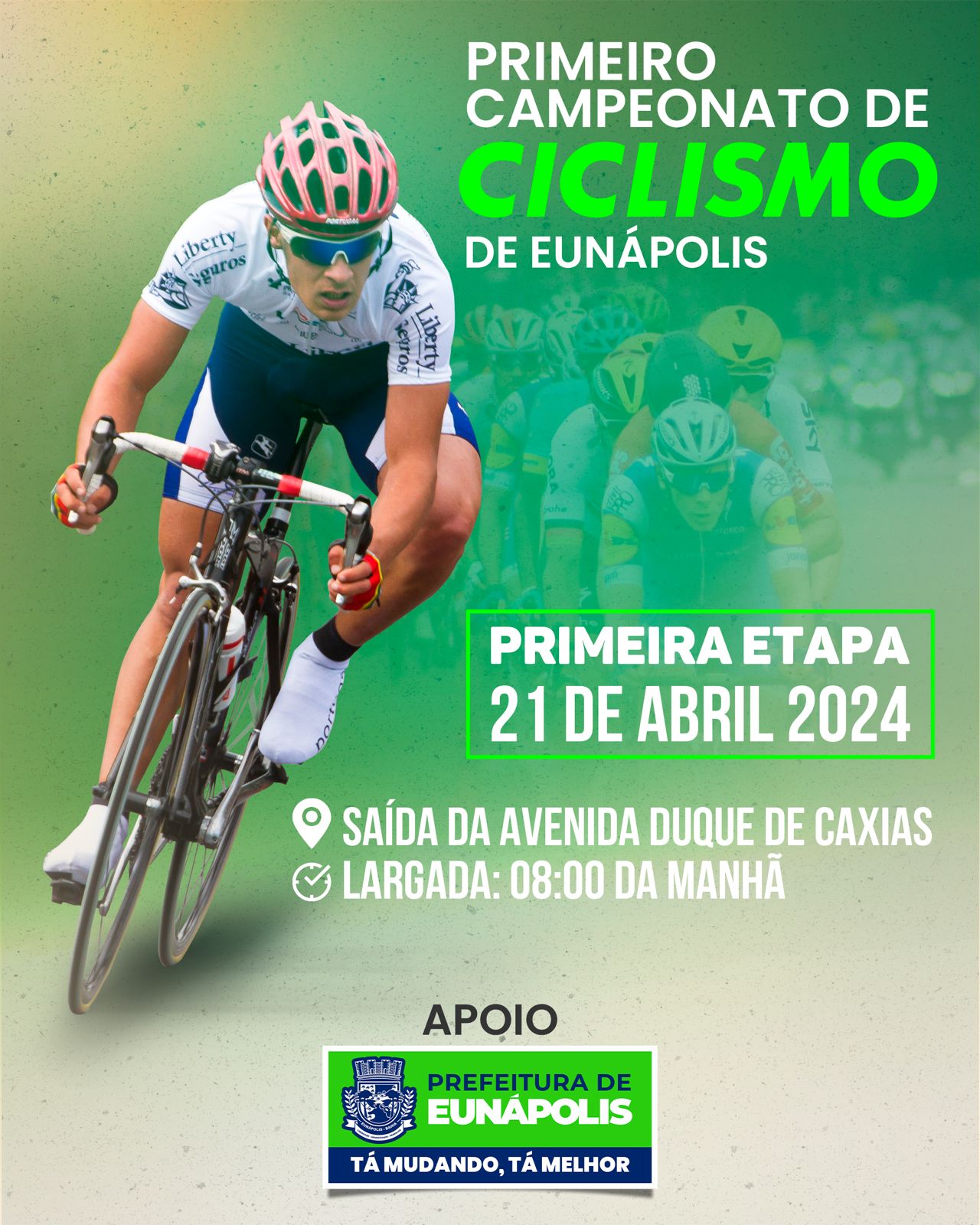 Os atletas de Eunápolis se preparam para mais uma competição neste domingo (21). A Primeira Etapa do 1º Campeonato de Ciclismo começa na Praça da Bandeira, a partir das 7h. O percurso terá duração aproximada de 4 horas, passando pelas principais avenidas do centro da cidade. “Este campeonato não é apenas sobre competir, mas sobre promover a inclusão e a saúde em nossa comunidade”, garante Antônio Cláudio, organizador. As inscrições podem ser feitas pelo site: https://inscricoes.bike/