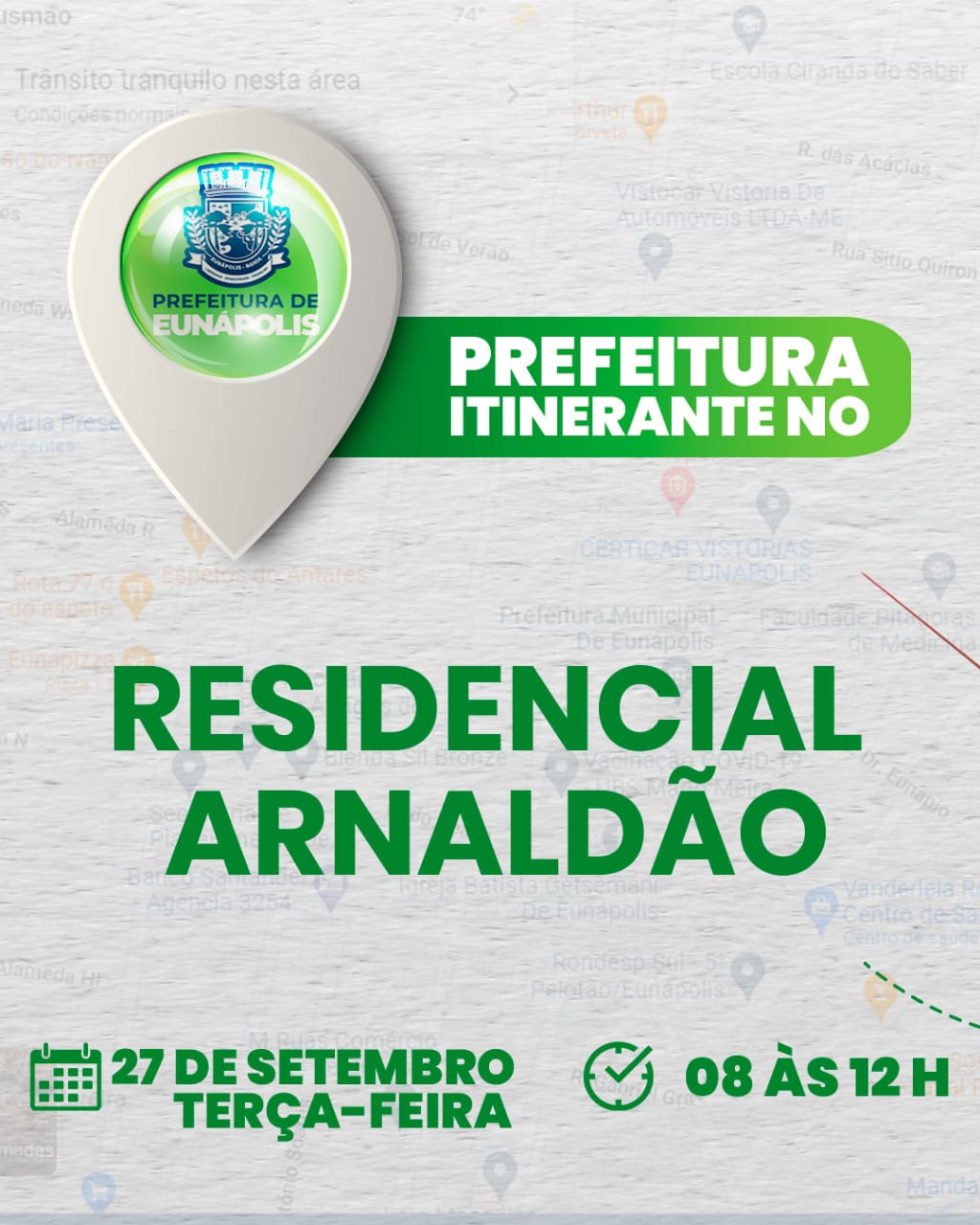 Para comemorar os cinco anos de fundação do Residencial Arnaldo Moura Guerrieri (Arnaldão), a gestão municipal de Eunápolis realizará uma edição do projeto “Prefeitura Itinerante”, nesta terça-feira (27). A ação acontecerá em frente à Unidade Básica de Saúde do bairro, a partir das 8h.