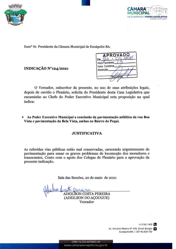 A Indicação número 124/2021 pede a conclusão da pavimentação asfáltica da rua Boa Vista e pavimentação da rua Bela Vista, ambas no bairro Pequi.
